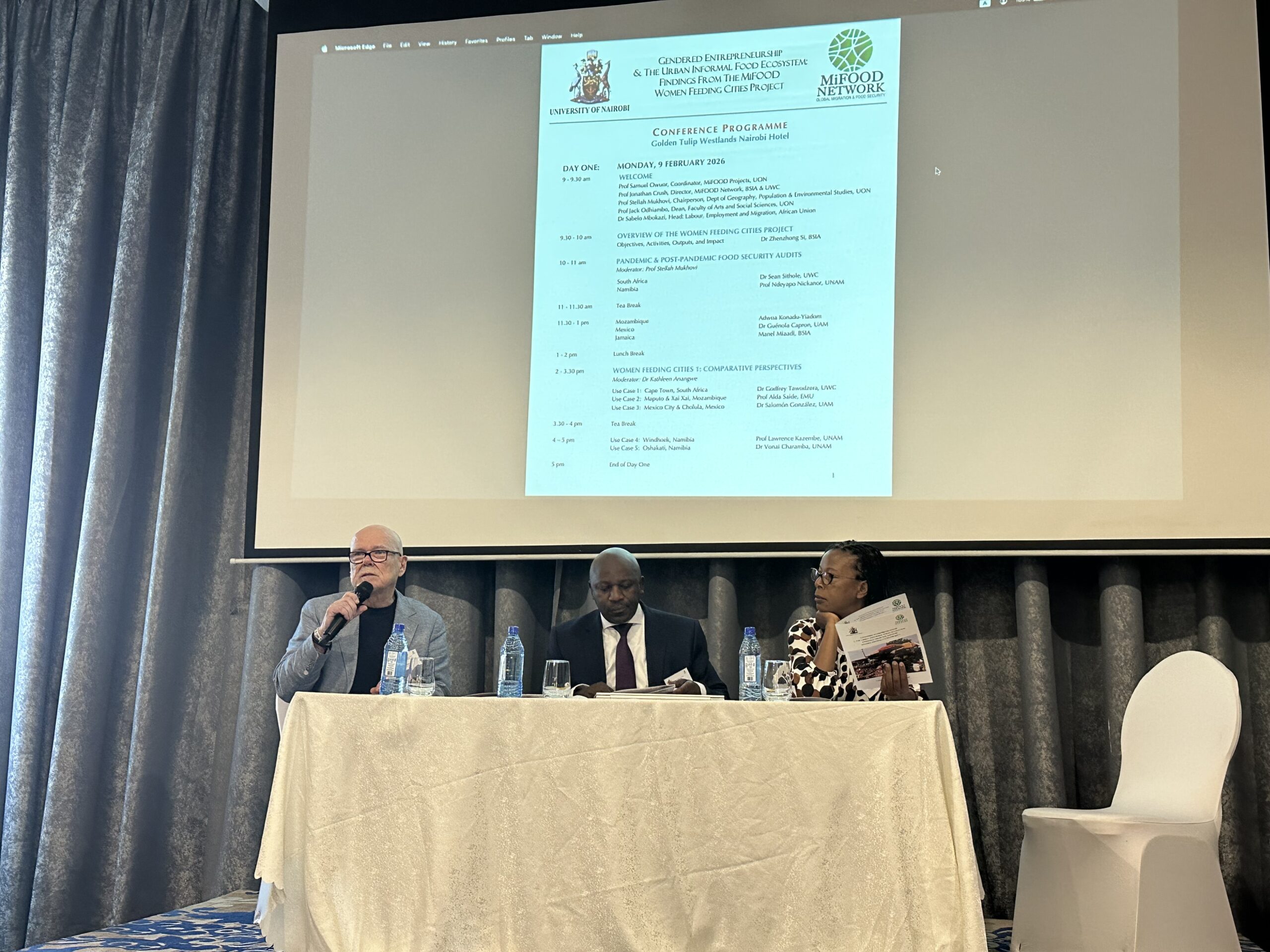 The conference opened with welcome remarks from Prof Samuel Owuor (Coordinator, MiFOOD Projects, UON), Prof Jonathan Crush (Director, MiFOOD Network, BSIA & UWC), Prof Stellah Mukhovi (Chairperson, Department of Geography, Population & Environmental Studies, UON), Prof Jack Odhiambo (Dean, Faculty of Arts and Social Sciences, UON), and Dr Sabelo Mbokazi (Head: Labour, Employment and Migration, African Union) .